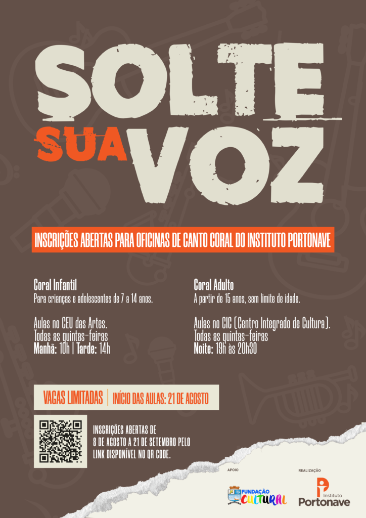 Música para transformar, unir e desenvolver talentos. O Instituto Portonave, entidade sem fins lucrativos, abre oportunidades para a primeira turma do “Coral Instituto Portonave” para comunidade, em Navegantes, nesta sexta-feira (8). Serão duas turmas de coro infantil para crianças e adolescentes de 7 a 14 anos no CEU das Artes, no bairro Nossa Senhora das Graças, com duas opções de horários, na quinta-feira, às 10h (20 alunos) ou às 14h (20 alunos), e um coral adulto para pessoas a partir de 15 anos no Centro Integrado da Cultura (CIC), no Centro, com aulas na quinta-feira, às 19h (40 alunos).